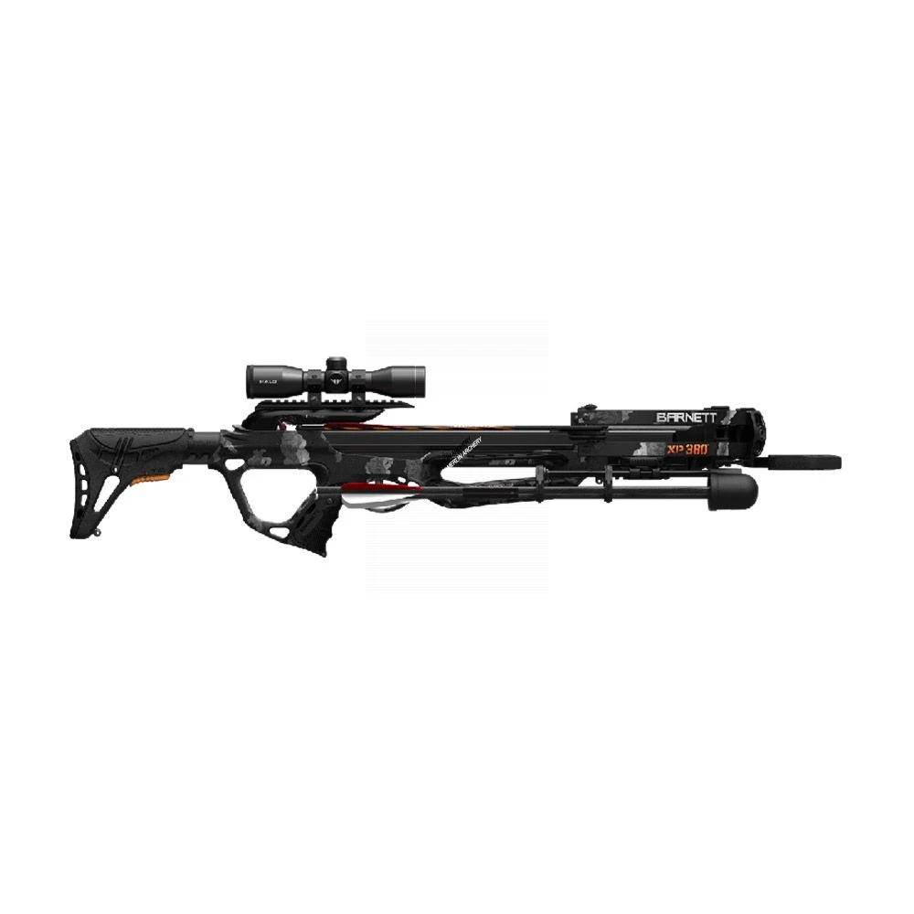 The XP380 features a pass-through foregrip, adjustable butt stock and exclusive Strike™ black camo for a complete package that looks good and shoots better. Laminated limbs add extra durability, allowing the compound crossbow to reach speeds up to 380 feet per second. The Explorer XP380 comes ready-to-hunt with two carbon arrows, 4x32mm multi-reticle scope, rope cocking device and lightweight quiver all included.